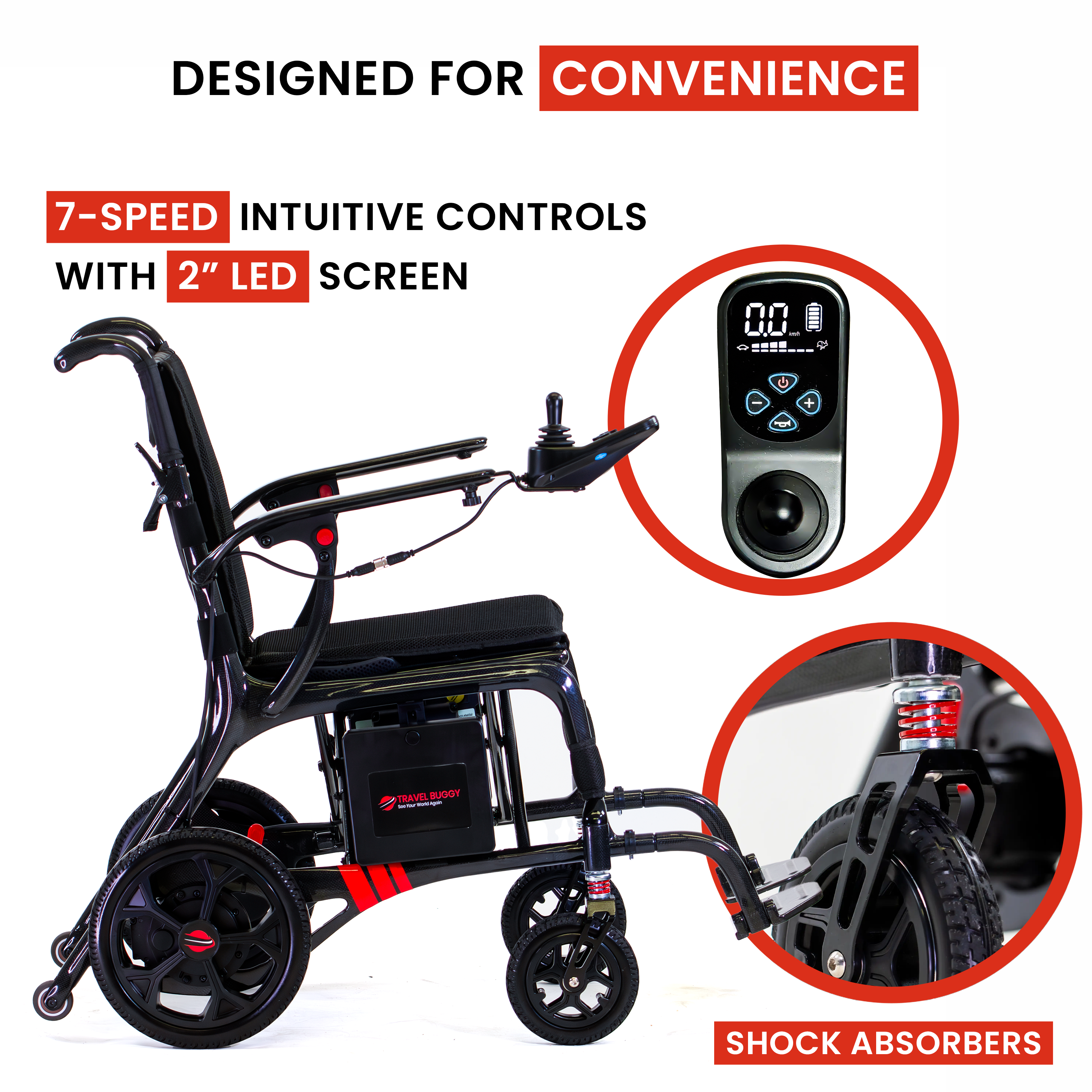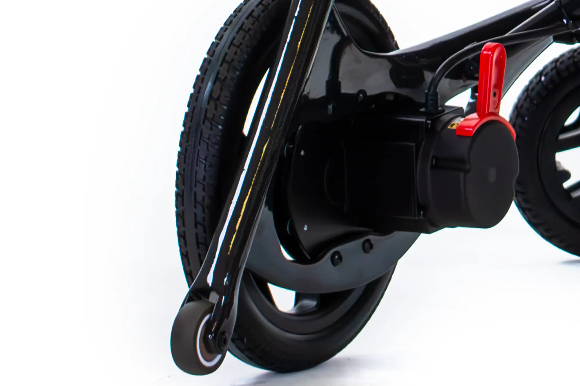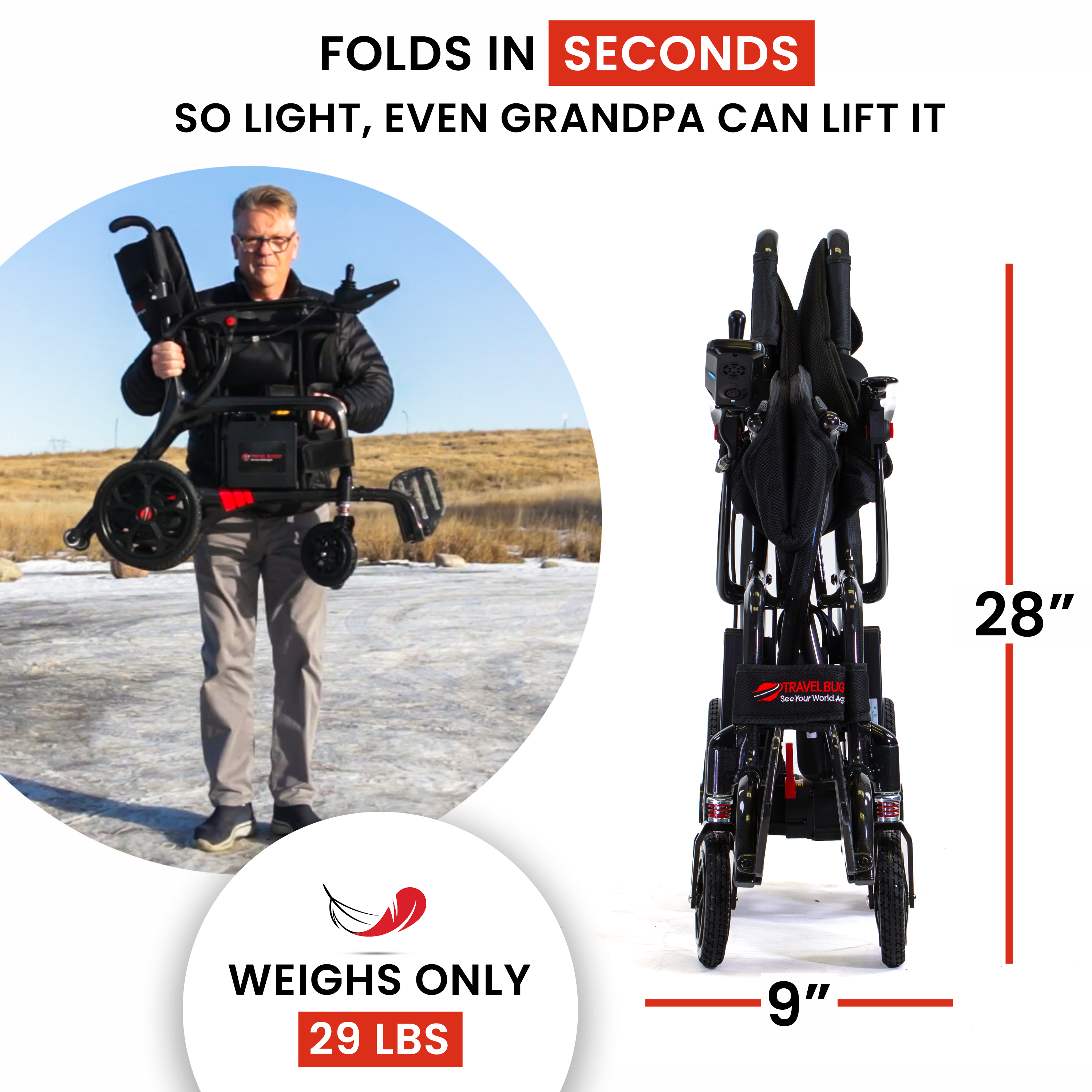 This easy-to-fold power wheelchair mobility device is suitcase sized and only 29lb with a slim 9 inch profile. A comfortable model that can travel up to 18km on a single battery charge.